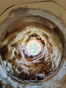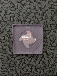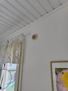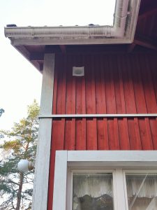 Tässä kohteessa oli ongelma korvausilman kanssa. Talo on varustettu koneellisella poistoilmapuhaltimella, joka poistaa ilmaa huonetiloista. Koneen imemä korvausilma ohjataan (tai rakentaja oli ajatellut, että näin se toimii) huoneisiin ulkoa läpivientien, ns. korvausilmalaitteiden kautta. Talossa oli vanhat, arviolta 90-luvulta olevat 70mm korvausilmalaitteet, joista kuva alla.