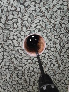 Koska laajennettiin olemassa olevia reikiä, ei voitu välttyä osumasta koolauspuihin. Jotta voitiin varmistua siitä, että tervapaperin hajua ei johdu rakenteen lävitse, läpivientiputki asennettiin ja massattiin rakenteeseen tiiviisti.